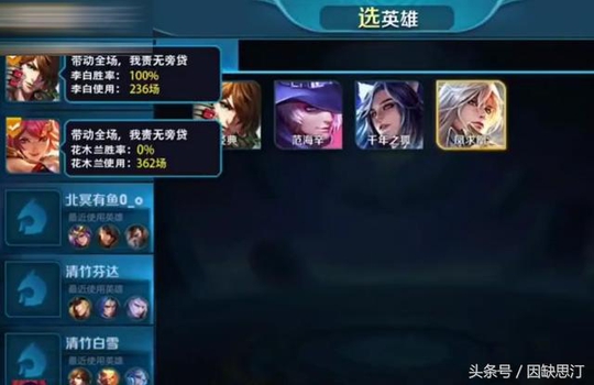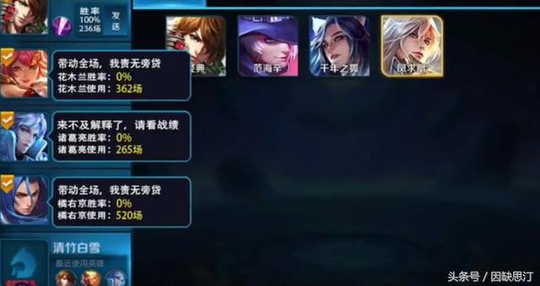 原来,这个国服李白在发战绩的一瞬间,他的队友花木兰也发出自己的战绩。我们可以看到,李白确实很强,236场排位100%胜利;而花木兰362场胜率却是0%。估计这时候李白的新咯噔一下,心想:这把遇到坑了。