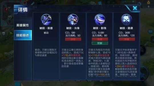 (被动技能)秘技·极意:兰陵王向敌人移动时会增加百分之20的移速,可以利用这个技能发现附近或者草丛里是否有敌人,如果兰陵王突然触发被动移速增加,就知道草丛里有敌人,改技能不仅可以提升兰陵王的的击杀能力和协助能力。还可以避免自己遭遇伏击。