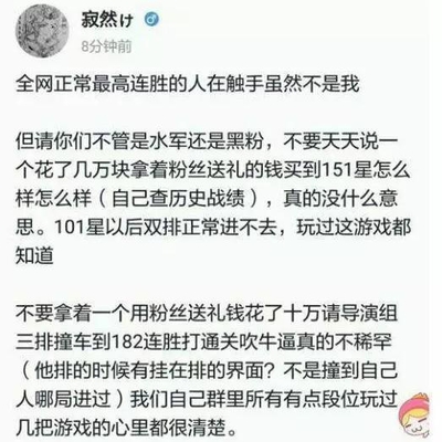 有网友质疑:在高手如云的王者段位能够拿到261连胜简直不可能,而且据说骚白在高端局的名声很不好,一直采用请演员的套路,这名爆料者也曾受邀做演员,但是他拒绝了。除此之外,还有一位主播也说在很久之前骚白还不火的时候,他就曾经请过演员,很轻松就从103星刷到了151星,并且最多连胜的主播也不是骚白。