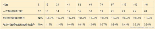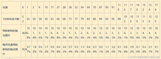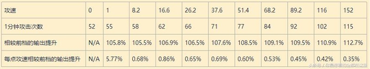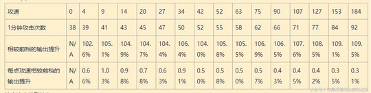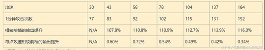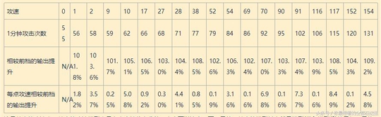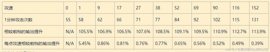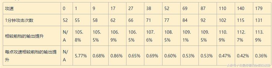每点攻速相较前档的输出提升 N/A5.77%0.68%0.86%0.65%0.69%0.60%0.53%0.53%0.47%0.42%0.36%