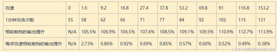 每点攻速相较前档的输出提升N/A 5.77%0.68%0.86%0.65%0.69%0.60%0.53%0.45%0.42%0.35%
