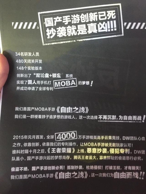 同年年底,以腾讯为首的MOBA手游王者荣耀又横空降世,这款游戏的出现彻底了垄断了MOBA手游,因为腾讯的势力雄厚和大力推发,王者荣耀人数持续暴涨,很快就占据了当时自由之战在线人数,也因腾讯开发的游戏,很多玩家们从自由纷纷转王者,没过多久,自由之战人数急剧下降,随着时间的推移, 这款游戏被彻底打入冷宫。为此,自由之战开发人员以申请国家专利的名义告向腾讯王者荣耀,这也是小编我第一次见到过有人告腾讯的抄袭,可谓是勇气可嘉!