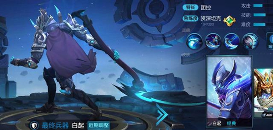 白起可以说是很厉害的一个坦克了, 能抗 能输出,肉装+不死鸟之眼 可是很恐怖的 ,后期你根本打不死他,就算群殴也不一定能打死他,体验服 的数据看,削弱名单有他,真是不削他 根本玩不了了。