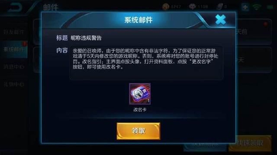 被体系检测出来了,该玩家收到了昵称违规警告,并且还送了一个更名卡给该玩家。为了保证您的可以正常玩王者荣耀,要求你5天之内更改昵称,要不然体系就会停止封号。这很较着就是强迫该玩家更改昵称。