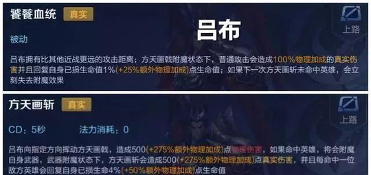 吕布的一技能命中敌方英雄后,普攻会变成真伤!并且下次一技能会触发高额真伤,但如果真伤一技能没有击中目标会失去真伤效果!值得一提的是!吕布的普攻真伤是可以暴击的!而且是唯一一个可以暴击的真伤!所以吕布不需要穿透,只要暴击、攻速、物理攻击力!这样的吕布,破军、闪电匕首、无尽都是非常好的选择。当然纯输出的吕布非常暴力,但不如半肉装站的住也是大问题。