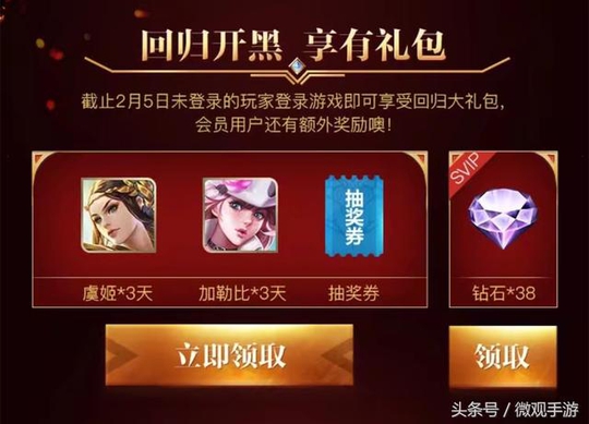 截止2月5日未登录的玩家登陆游戏即可享受回归大礼包,必得虞姬体验卡和虞姬加勒比小姐体验卡以及抽奖券。SVIP用户还将额外获得30钻石的奖励。