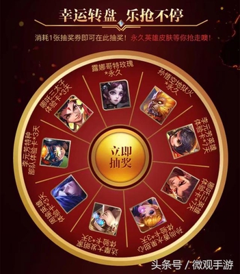 获得抽奖券后,启动活动转盘界面将有机会获得永久的露娜哥特玫瑰或者永久的孙悟空地狱火以及周瑜、哪吒、李元芳体验卡以及孙尚香水果甜心等皮肤体验卡。