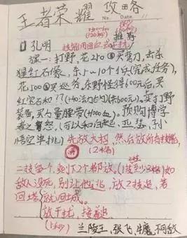 比如近日王者扒到的一本《王者荣耀攻略》,作者——某某某小学生。从字迹来看,我们基本可以判断出就是小学生(成人会写这玩意?)。这本“秘籍”不仅有文字说明,还有图片、注释等元素,图文并茂!