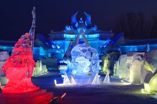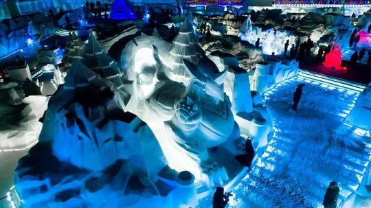 在夜晚,当所有的自然光都消失,这些冰雕雪雕里的灯光就发挥了它们最大的作用,俯瞰下来,这样的景象可以用“壮观”二字来形容了。