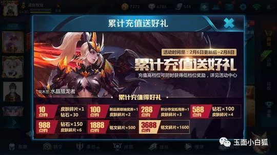 诸葛亮小黑板的彩蛋已经全部揭晓,为了迎合武陵仙君1314点券,特意推出了一个充值活动。本活动跟以往一样,选择充值988点券是最划算的,再高就只有铭文碎片了。所以对于中小R玩家,平常趁着充值活动存点券,可以得到不少好处,这里至少可以得到15个皮肤碎片。