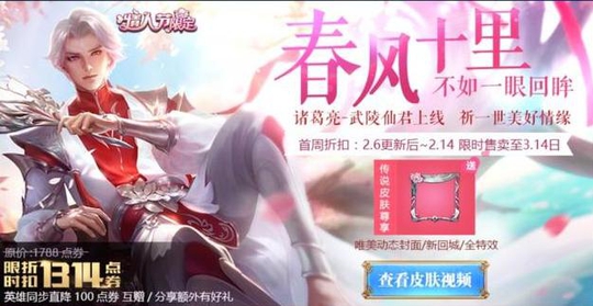 情人节皮肤是诸葛亮的武陵仙君,之前被命名为桃夭,总之粉红色很妖艳啦。今日已经开始卖了,1314价格还算始终,喜欢诸葛亮的可以掏钱包了。