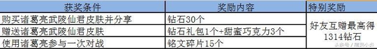今天皮肤上架后还开启了专属活动,参与活动可以收集到大量钻石,其分享武陵仙君皮肤可以获赠钻石礼包,幸运的话还可能抽到1314个钻石,此外,在活动期间使用诸葛亮参与对战还有铭文碎片奖励,小炎总结了一下,本次特别活动能拿到的钻石有60~1314个不等,钻石可以用于夺宝消耗,多多益善,活动已经开启,想要的小伙伴们赶紧行动起来吧。以下是活动奖励表,大家可以了解一下。
