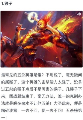 第一的是人见人怕的猴子,技能有加速有位移有盾,简直是刺客法师坦克的特性结合体。关键是暴击高的猴子可是见谁敲谁,到了后期别说脆皮,就是梦奇过来也要跑。当然克制猴子的方法很多,在高端局猴子拿五杀并不容易。