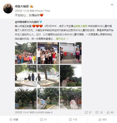 而获得人气王的大锤哥,“不忘初心,方得始终”,更是将自己人气王所得到的奖金捐赠给了中国成都SOS儿童村。从公益组织所发布的微博能够看出来,本身作为成都人的大锤哥早就在学生时代就参加过慰问SOS儿童村的活动,算是很早就开始关注公益的热心人了。