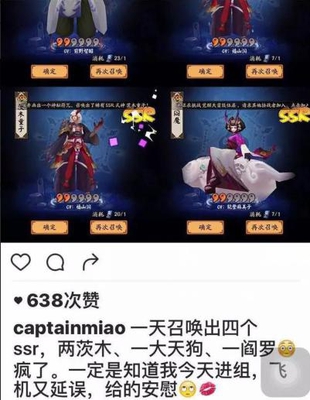 先前倪妮在INS上晒出一张图,只见她在阴阳师里面,一天召唤出了四个SSR的式神,两个茨木,一个天狗一个阎罗,小编和一大票人到现在都没有召唤出一个SSR,倪妮的欧气也太强了,网友们都嫉妒疯了,真的是人比人气死人,让小编沾沾这欧气冷静一下。