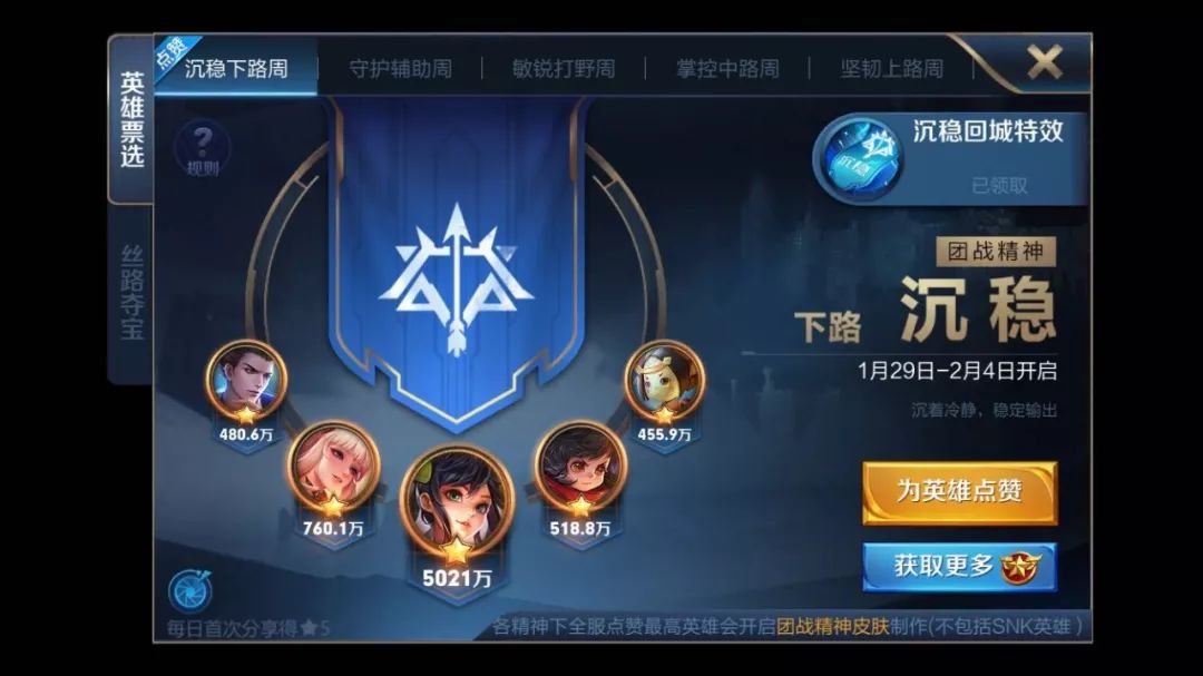 3.使用团战精神之星点赞,自然周累积40次即可获得对应限时回城徽章和1枚永久特效兑换徽章,5枚永久特效兑换徽章,可以兑换任一永久回城徽章,所以务必每周都点赞满40次,不然就无法获得永久版了