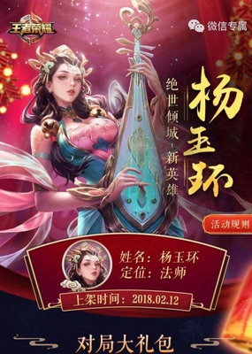 王者荣耀新英雄杨玉环上线时间确定!根据微信王者荣耀专区的爆料,新英雄杨玉环将会在2018年2月12日(下周一)正式上线。