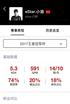 经过对比,挂牌的eStarPro.小渝、AS仙阁小羽、AS仙阁雨雨三位打野选手,小渝的赛事履历最为丰富,作为eStarPro曾经的队长,他带领战队夺得首届王者冠军杯冠军,2017KPL春季赛四强,2017王者冠军杯亚军,特别是在2017冠军杯中他的打野锋芒毕露,各项赛事数据均高于联盟平均水准,场均击杀更是名列前三,在打野方面小渝依然有很大的潜力可以挖掘。
