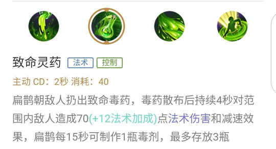 一技能:致命灵药,扁鹊朝敌人扔出致命毒药,毒药散布后持续4秒对范围内敌人造成70(+12法术加成)点法术伤害和减速效果,扁鹊每15秒可制作1瓶毒剂,最多存放3瓶。扁鹊的一技能反而是他的一个弱势,看情况的,但是扁鹊一般没有一技能的时候是最好杀他的时候,遇到这样的情况直接上,不要犹豫。