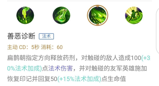 二技能:善恶诊断,扁鹊朝指定方向释放药剂,对触碰的敌人造成100(+30%法术加成)点法术伤害,并对触碰的友军英雄施加恢复印记并回复50(+15%法术加成)点生命值。这个技能就是一个辅助技能,当然了也是可以叠加被动的技能,还有扁鹊的这个技能在对敌的时候非常有利于配合队友。