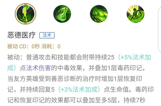 被动技能:恶德医疗,普通攻击和技能都会附带持续25(+5%法术加成)点法术伤害的中毒效果,并叠加1层毒药印记,当友方英雄受到善恶诊断的治疗时增加1层恢复印记,并持续回复5(+3%法术加成)点生命值。毒药印记和恢复印记的效果都可以叠加至多5层,持续7秒。这个是扁鹊的核心技能,只要扁鹊这个被动叠加起来伤害是非常恐怖的,对付扁鹊没有其他好的办法只有出魔抗,最好不要一个人去与扁鹊对刚。