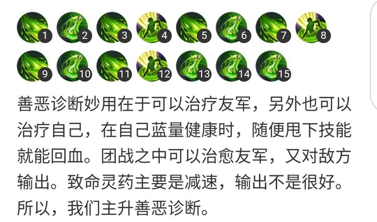 技能加点:善恶诊断妙用在于可以治疗友军,另外也可以治疗自己,在自己蓝量健康时,随便甩下技能就能回血。团战之中可以治愈友军,又对敌方输出。致命灵药主要是减速,输出不是很好。所以,我们主升善恶诊断。一技能的减速是扁鹊击杀敌人的关键,但是一技能的效果就那样,一旦没有已经能很容易被切死。