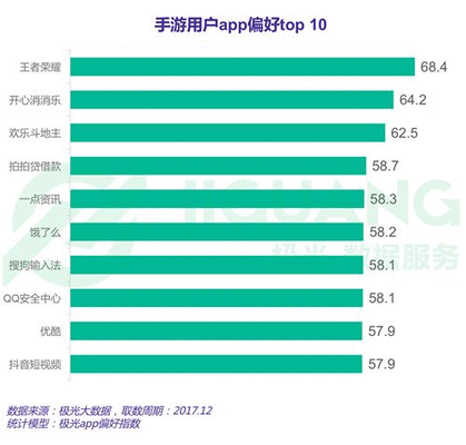 在用户偏好方面,王者荣耀居于首位,偏好值为68.4,其次是开心消消乐居与欢乐斗地主。细分来看,女性用户更喜欢拍照P图类app,男性用户偏好王者荣耀、欢乐斗地主、陌陌等。