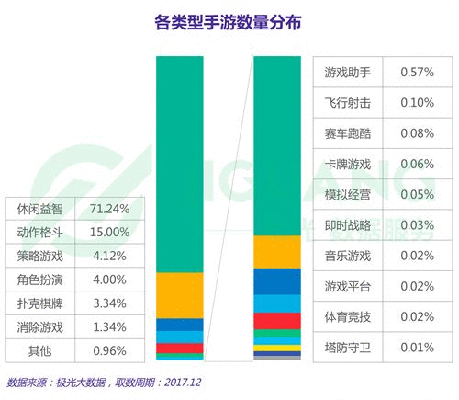 看完用户画像,来看看手游类别分布。2017年,手游市场上的休闲益智类手游app最多,占据手游app总量的71.24%,其次为动作格斗类,占比15.00%,剩下各类手游占比皆在5%以下。