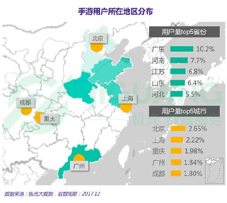 另外,调查还发现,北京、上海和重庆是手游用户最多的3个城市,而广东省是用户最多的省份,拥有10.2%手游用户。