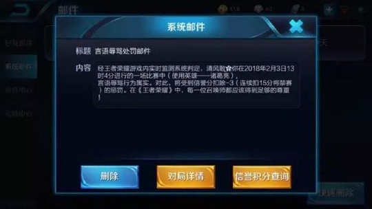 不仅如此,玩家郁闷的打完比赛后,回到主界面就收到天美发来的一封邮件,里面竟告诉他由于言语辱骂被扣3分……