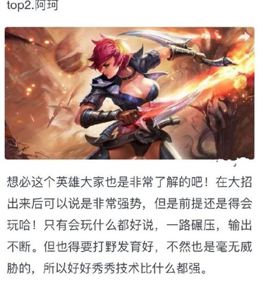 TOP2是最常见的刺客之一阿珂,为什么难玩呢?因为他只是一个收割的英雄,如果敌方不残血,根本无法发挥出作用。当然收割也是需要良好发于的,玩的不好的也是开团就送,特别是被控住之后就很难逃脱了。