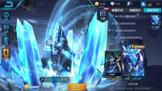 关羽的冰锋战神可以说是最良心的皮肤了,售价不高,特效是十分的帅气。而且,冰锋战神的关羽的外形可以说是王者荣耀中数一数二帅气的。最后说到他的出场动画,完全媲美传说皮肤。按时,冰锋战神是王者荣耀一周年限定皮肤,想要买到只能等返场。