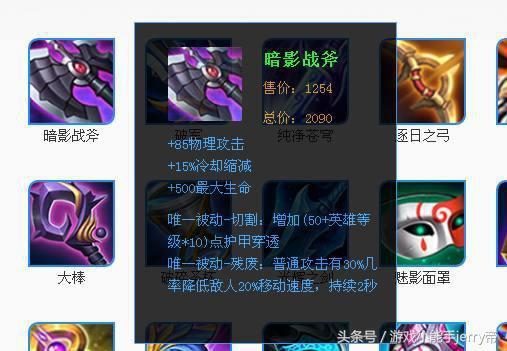而黑切,也就是暗影战斧,虽然英雄主要利用其的属性是护甲穿透。然而黑切的其他增益效果也是非常的给力的。15%的冷却缩减、还有一个减速敌人20%的移速效果。这两点对于吕布也是非常关键的,可以大大提升吕布的切后排能力。再退一步说,就是唯一被动-切割的护甲穿透,对于吕布也不是没用的啊。吕布虽然是打真实伤害的,但前提也是建立在吕布的1技能命中情况下。所以黑切在一定程度上,是可以弥补容错吕布的1技能啊。所以黑切对于吕布的作用,也是非同一般的!