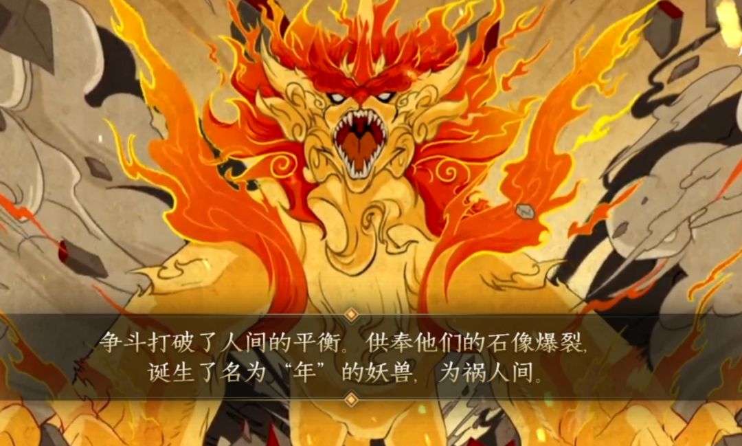 后果是,被一个小怪兽“年兽”趁机而入,本来是供奉二人的石像,结果爆裂而开,诞生了“年”,为祸人间。