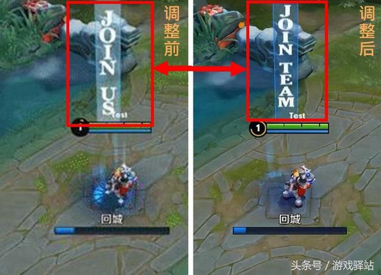 回城特效原本的英文标识是JOIN US更改后变成了JOIN TEAM,即加入我们改为了加入团队,调整前后对比如下:(PS:调整后释放大招也多了JOIN TEAM的标识)
