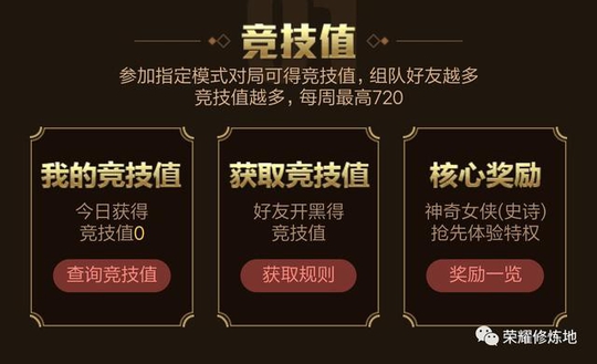 活动时间是9号~23号,玩家参与活动是要获取一种叫“竞技值”的东东。5v5对战(无论是五军、赏金、排位、乱斗等等,只要是10个人打的,非人机、非开房间)一局可以获得15点基础竞技值,与好友组队每局还有额外竞技值(胜利+4好友组队,单局最高可达到40点),每天竞技值上限是100点。