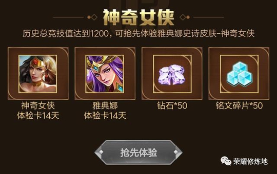 2.体验新皮肤神奇女侠。当玩家的幸运值达到1200(消耗掉的也算),就可以在活动结束之后领取体验礼包,内含神奇女侠*14天、雅典娜*14天、钻石*50、符文碎片*50。