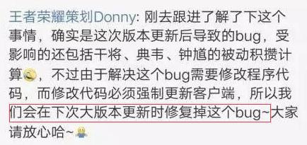 另外还有三名英雄也同时受到了影响,包括干将莫邪、典韦、钟馗,其被动积攒计算出现错误。虽然BUG已经发现了,不过根据官方的回答,解决这个BUG需要修改程序代码,强制更新客户端,所以要等到下个大版本更新才能修复。对于官方的这个回答,许多玩家小伙伴的评论画风尤其一致。