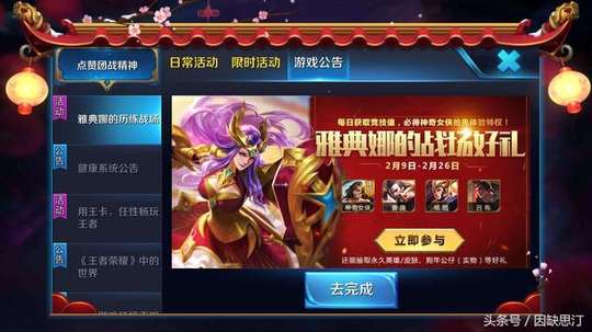 但是,这个活动的具体位置有点隐秘,在游戏内——活动——游戏公告——雅典娜的历练战场——去完成。