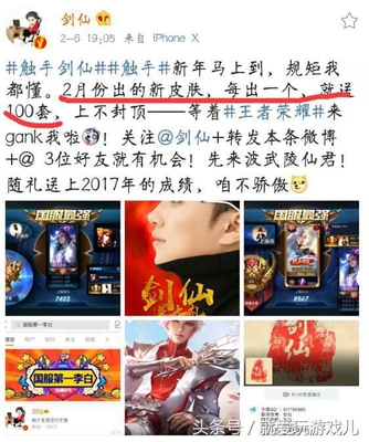前一段时间,剑仙的一条微博引起了王者峡谷内的玩家们当然主要是剑仙的游戏粉丝的重点关注。因为要过年了,剑仙表示套路这个东西大家都懂,而且剑仙表示自己不搞事情就算了,要想搞事情那么肯定是要搞大事情了。他不会像一些游戏主播那样小打小闹,一出手肯定就是大批大批的游戏福利。