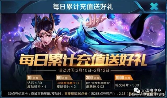 活动在2月10日~2月12日在活动开启期间,每次充值都有30钻石,3个皮肤碎片,30点券等活动,活动仅限三天,每天至少充值6元钱,商城可以直接抵扣点券,更多资讯关注大逗虫电竞。