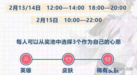 活动时间:2月13日~2月15日指定时间段,详细时间点请查看下方图片。