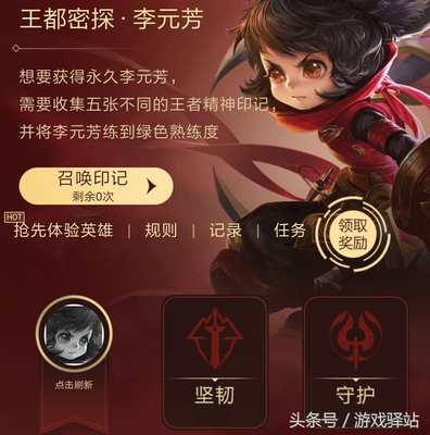 选择好英雄后可领取该英雄的30天体验卡,使用许愿英雄参与对战任务可获得精神印记,分别为坚韧、守护、敏锐、沉稳和掌控,比如使用李元芳参与对局和胜利一次都可以获得一次召唤印记的机会,除此之外印记不够也可以通过好友赠送获得,积满五个印记和将英雄练到绿色熟练度即可领取永久许愿英雄!