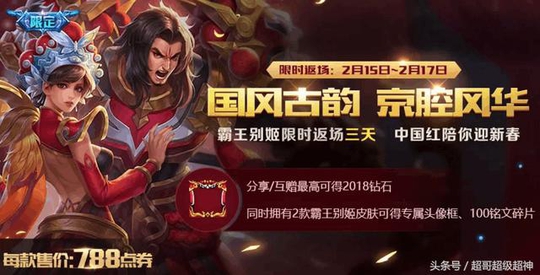 3、限时返场-霸王别姬。这两款CP中国风的皮肤也是老久没返场了,这次返场相信也能满足很多小伙伴的意愿。返场的时间只有2月15日到2月17日三天时间,直售分别都是788点券,啥也别说,又要150块人民币……唉