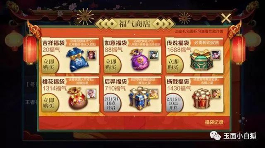 活动内容:玩家通过活动页面,使用点券购买福气(1:1的比例),福气可以像QQ红包一样发出去,也可以兑换六种福袋,福袋可以在游戏内赠送,也可以直接打开,将有概率获得永久皮肤。