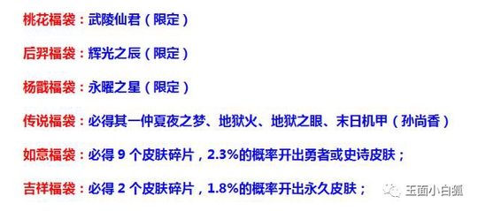 六种福袋:桃花福袋(1314福气或点券)、杨戬福袋(1430福气或点券)、后羿福袋(710福气或点券)、传说皮肤(1688福气或点券)、如意福袋(88福气或点券)、吉祥福袋(20福气或点券)。