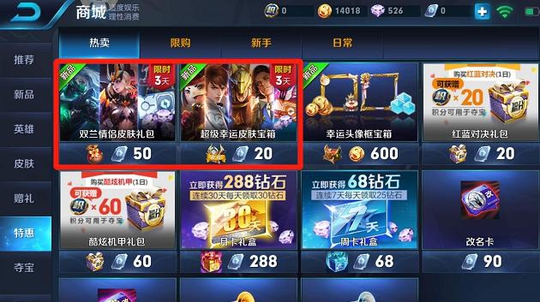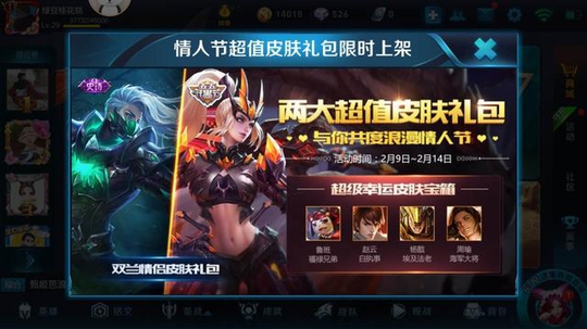 二、双兰情侣皮肤礼包上架,奖励包含永久花木兰水晶猎龙者和兰陵王暗影猎兽者、积分夺宝抵用券、英雄/皮肤碎片和钻石,礼包限时上架5天,对这两款皮肤感兴趣的玩家可依据自身需求选择抽取!