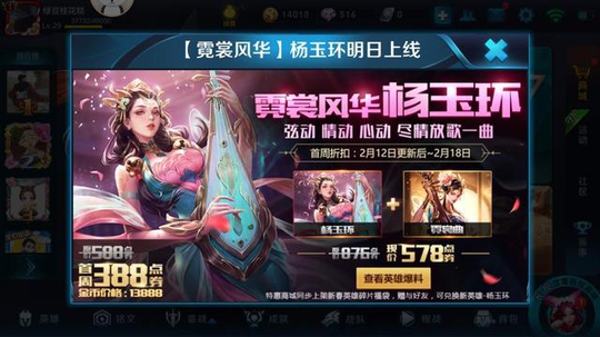 王者荣耀新一轮版本更新定在明天,此次更新后新英雄杨玉环将正式上线,通过官方刚刚在游戏内发布的新英雄预告得知其售价确定为13888金币,而杨玉环和皮肤霓裳曲打包首周价格为578(2月12日到18日)。