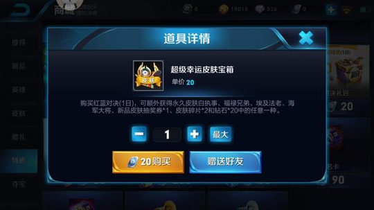 三、超级幸运皮肤宝箱上架,永久皮肤有赵云的白执事、鲁班七号的福禄兄弟、杨戬的埃及法老和周瑜的海军大将,该礼包抽中永久皮肤的概率为2.8%,想必不少玩家对白执事感兴趣,若对自己手气有信心的话可尝试抽取!