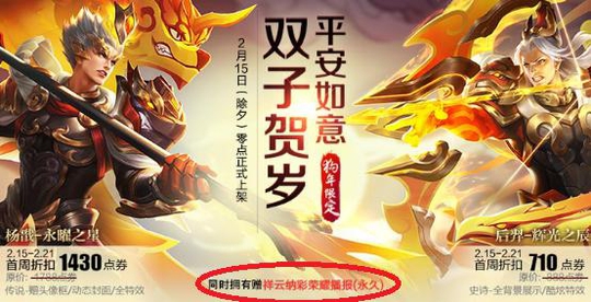 同时拥有杨戬和后羿的狗年限定皮肤,就会赠送永久的祥云纳彩荣耀播报,之前送的各种播报都是有时效的,有的三天,有的七天,而这个荣耀播报就是第一款永久荣耀播报!